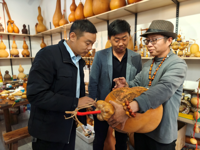 中华保险聊城中心支公司工作人员(左一)和堂邑镇路西村党支部书记邹孟文(中)参观葫芦雕刻工作室。本报记者 姚慧/摄