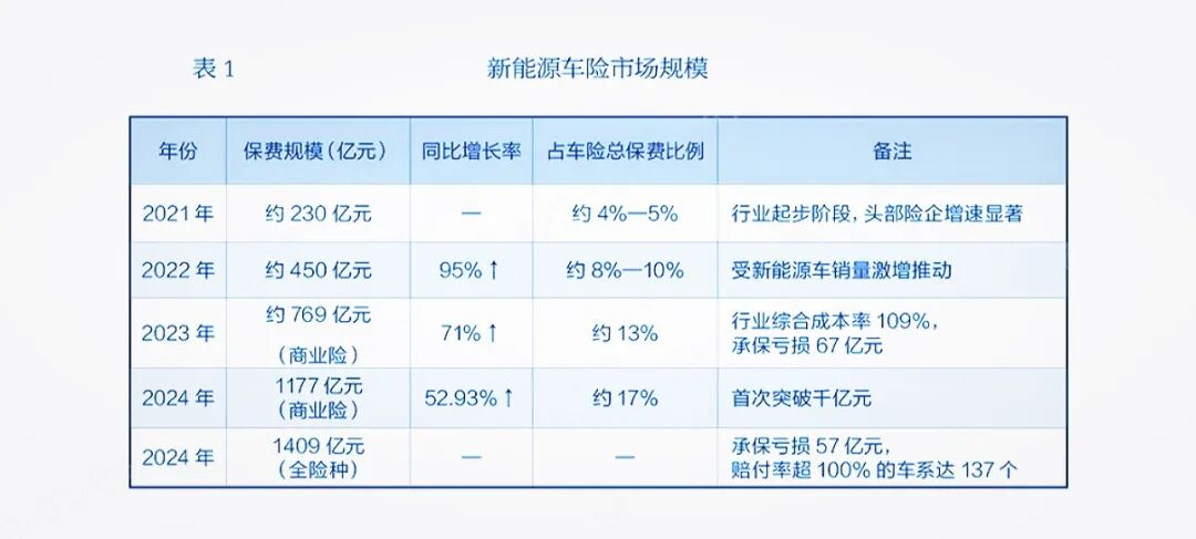 近年来,我国新能源车险保费规模呈现出快速增长的态势,如表1所示。2021年,我国新能源车险保费规模达230亿元,处于行业起步阶段,头部险企增速显著。2022年,新能源车险保费规模进一步扩大,达到450亿元,同比增长约95%。2023年,新能源车险保费依旧保持71%的高速增长,成为拉动财险行业及车险业务的重要引擎。2024年我国新能源汽车保费收入1409亿元,但承保亏损57亿元,赔付率超100%的车系达137个。这些数据充分表明,新能源车险市场具有巨大的发展潜力和广阔的市场前景,但同时也面临经营亏损的挑战。